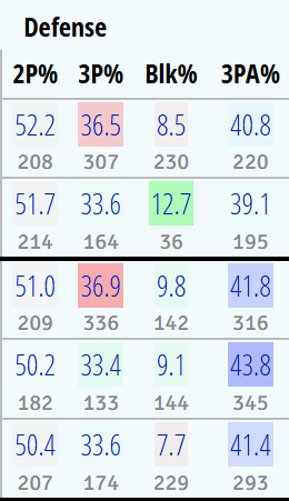 David Riley’s defensive history with 2025-26 on top, via kenpom.com. KEY: 2P% and 3P% = percentage of 2s/3s allowed; Blk% = percentage of opponent 2s that WSU blocks; 3PA% = 3 attempts divided by overall attempts.