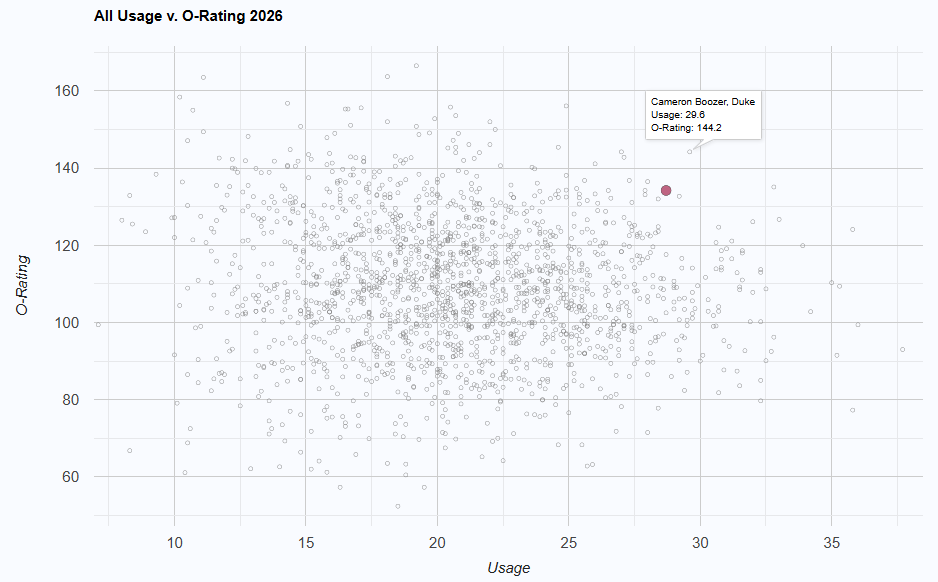 The efficiency with which Glass is scoring in a high-usage role — even off the bench, he was taking a lot of shots — is totally bonkers. To try to put in context what he’s doing, here’s a chart of all the freshman in college hoops who have played 50% of their team’s minutes. The horizontal axis is usage (possessions that end with that player doing something) and the vertical axis is offensive rating (efficiency). The best players are in the upper right quadrant. The red dot is Ace … along with a useful highlighted reference point: