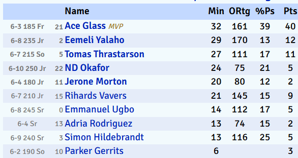 Line o’ the night: ACE GLASS, of course, with those 40 points on just 14(!!) shots — 6-of-9 from 3, 3-of-5 from 2, 16-of-18 from the line. He also had 3 rebounds, 2 assists, a steal and three turnovers.